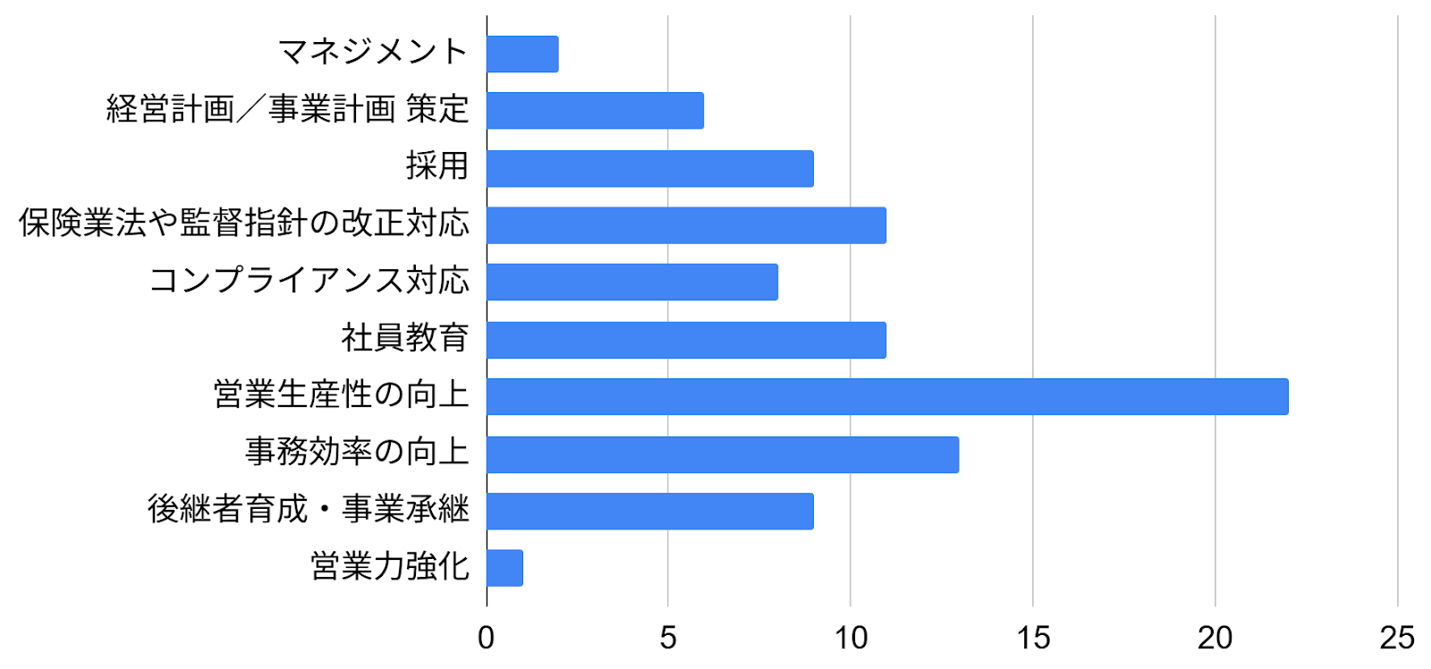 また、「社員教育」や「後継者育成・事業承継」など、組織の持続的な成長に関わる課題も高く、募集人ひとりひとりではなく、組織全体の強化を目指していることが分かります。