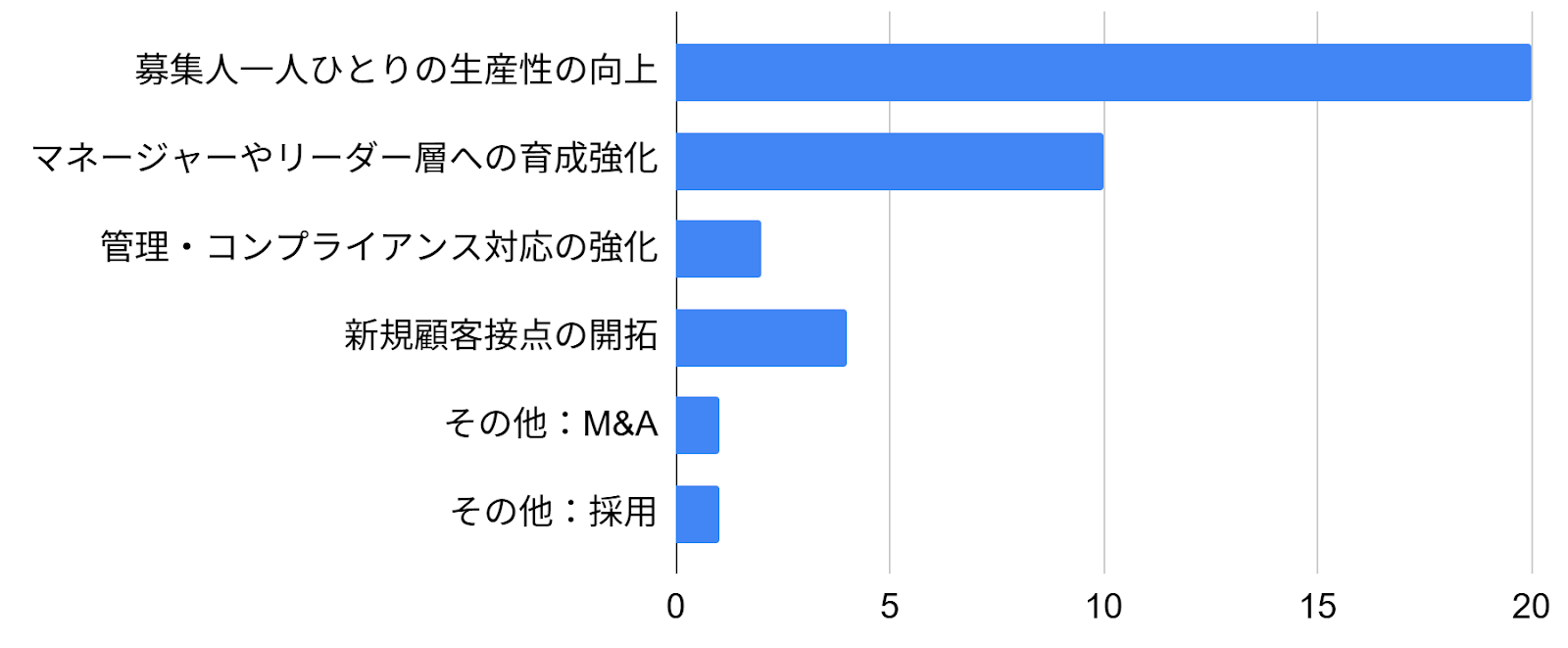 最も回答が多かったのは圧倒的に「営業生産性の向上」であり、次いで「事務効率の向上」「社員教育」が挙げられました。